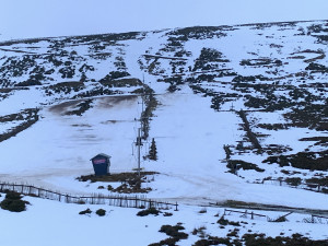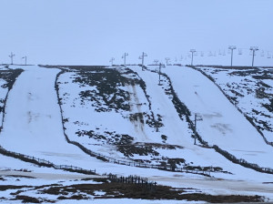 Most of the fenced main runs are still full width at the Lecht, though thin / worn areas, and damp mild air mean it is skiing better than it looks with granular spring snow conditions.