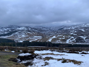 |  Looking out from the viewpoint over Corgaff Castle - there is still widespread but patchy snow cover to low levels.