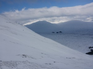 A claggy and misty morning on the upper mountain with flat light and a cold northerly wind but the weather improved in the early afternoon with clear skies and sun by the end of the day. Freezing at all levels and -1C at car park.